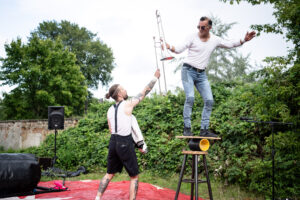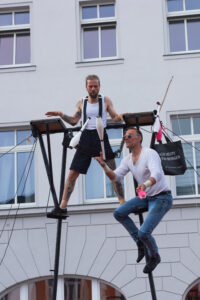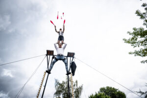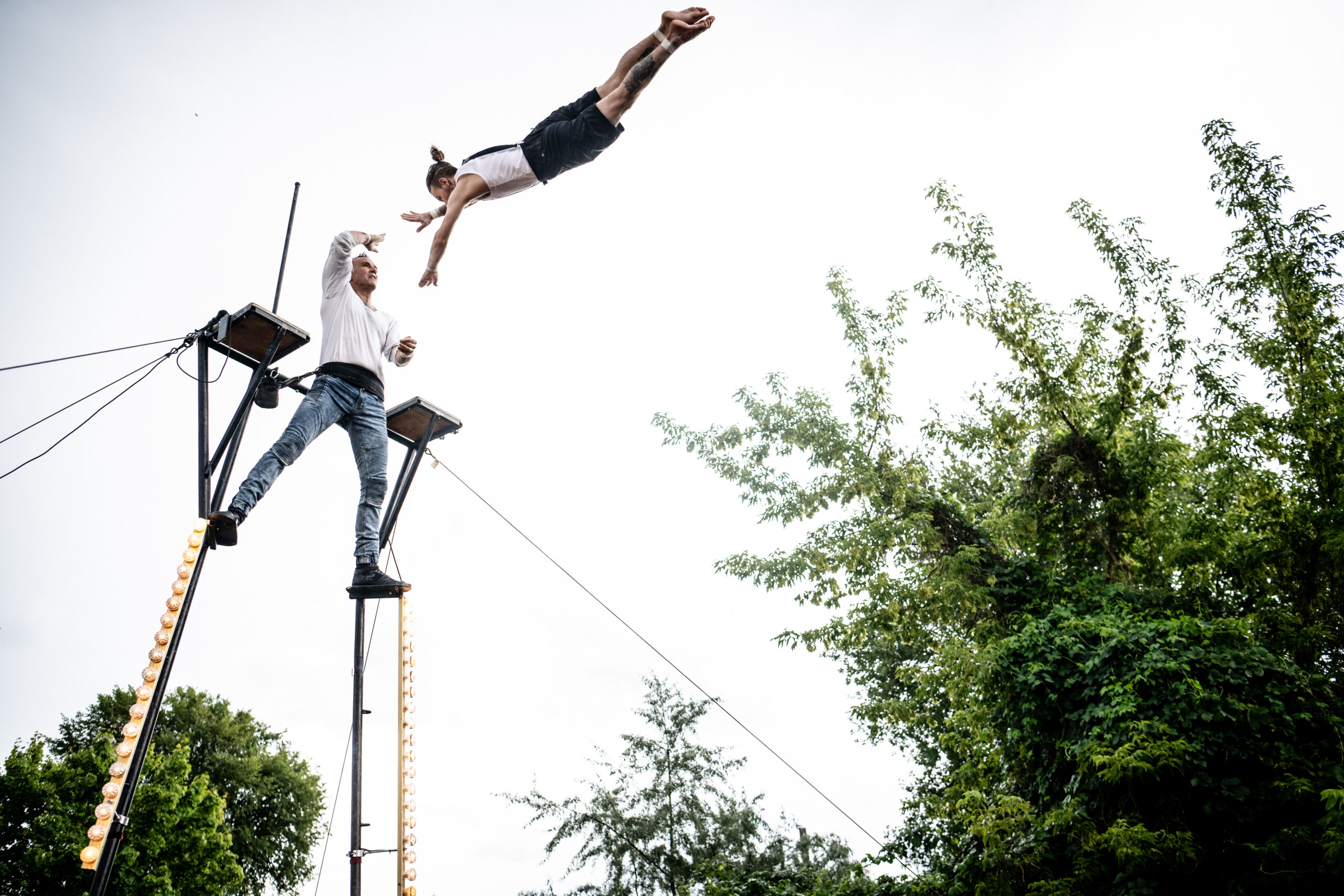 An almost five metre high Korean Cradle becomes the setting for an aerial duel. Misirlou mixes slapstick, juggling and rock’n’roll absurdity into the fairground atmosphere with dizzying precision and caustic humour.